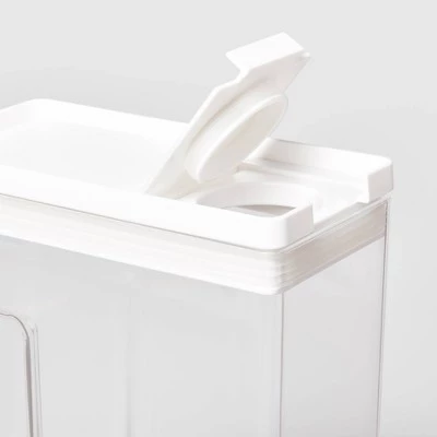 Perfect for cereal, oats, rice and other dry goods, this Clear Plastic Food Storage Container with Snap Lid from Brightroom™ will make a great addition to your pantry, shelf or kitchen counter. This 8″ x 4″ x 11.5″ simple, clear canister has a clean look and stackable design to save you space and make your everyday kitchen and pantry essentials easy to find. An indented back lets you easily lift and hold the container. This handy food storage container has white snap lid with pour spout to keep your food fresh and give you easy access to contents. Hand wash only.