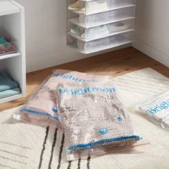From clothes to bedding and more, keep your belongings protected and stored with the 3-Piece Compression Bags from Brightroom™. This pack of three large compression bags meet your everyday needs whether you’re storing items for later use at home or packing them for travel. Showcasing a clear construction, these plastic compression bags make it easy to see the contents, and help keep the items protected from dirt, insects and spills. BPA-free, these airtight compression bags help keep the contents odor free, and their water-resistant design brings added convenience. And best of all, you can use these bags again.